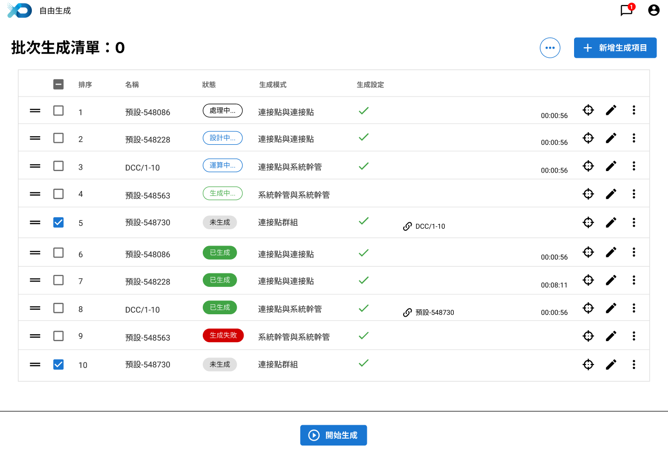 - 查看生成狀態:共有「未生成」、「處理中」、「設計中」、「運算中」、「已生成」及「生成失敗」6種狀態。 若為已生成的狀態,在該筆資料列的右側將會顯示該生成項目的生成演算耗時。