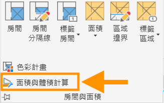 進到Revit功能列中的「建築 > 房間與面積」的功能區域,展開之後,選擇「面積與體積計算」