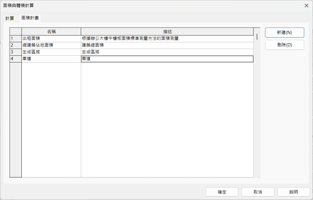在「面積與體積計算」的功能視窗中,選擇「面積計劃」,並點擊「新建」按鈕,建立兩個新的面積計劃類型,一個是給指定要佈置撒水頭/泡沫頭區域,另一個則是給指定要劃定車道/走道區域所用。
