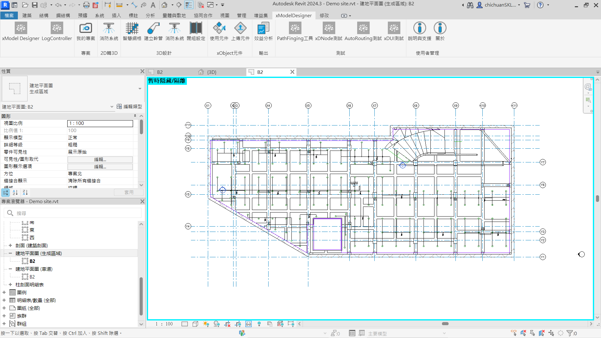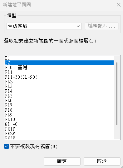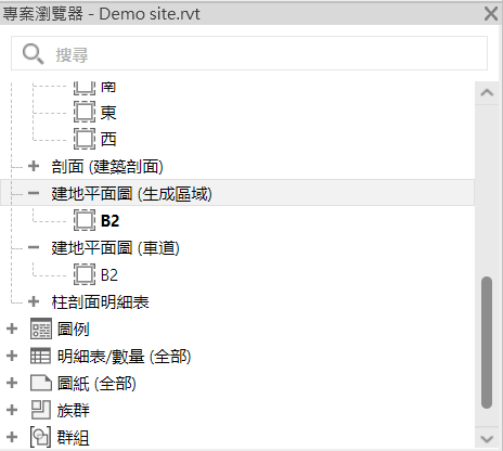 在Revit的專案瀏覽器中,開啟新建立的「建地平面圖(生成區域)」項下的要生成系統的樓層。此範例的樓層為B2。