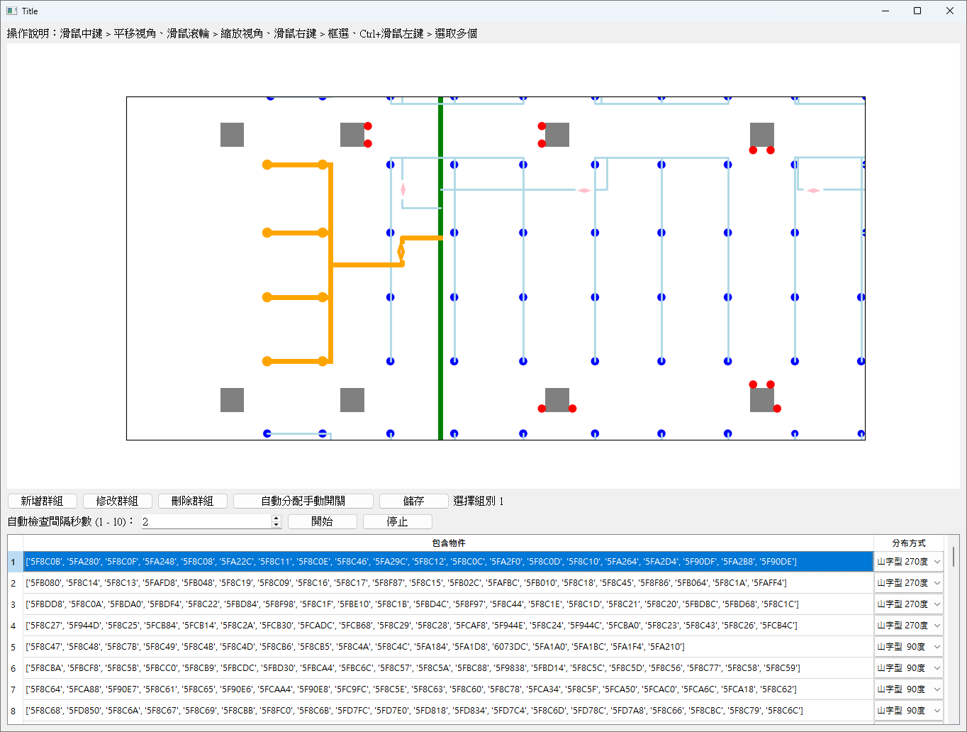 檢查撒水或泡沫系統群組的辨識成果,一個完整的群組可能會包含泡沫噴頭、泡沫支管、一齊開放閥與手動開關等圖元。若被系統辨識為同一個群組(grouping),則該群組的圖元將會以粗框橘線呈現。