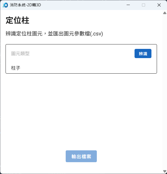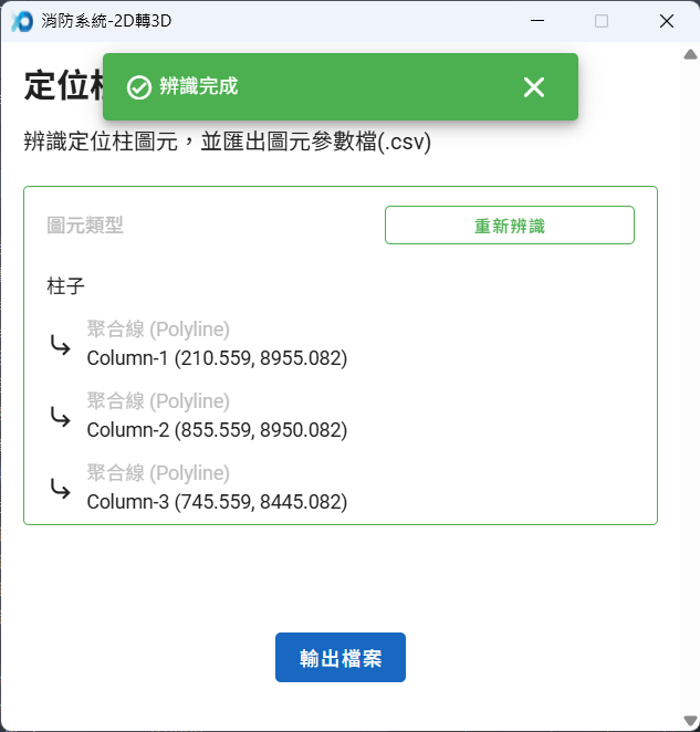 - 完成辨識後,點擊「輸出檔案」,指定定位柱圖元檔案所儲存的資料夾位置後,即可完成圖元辨識。