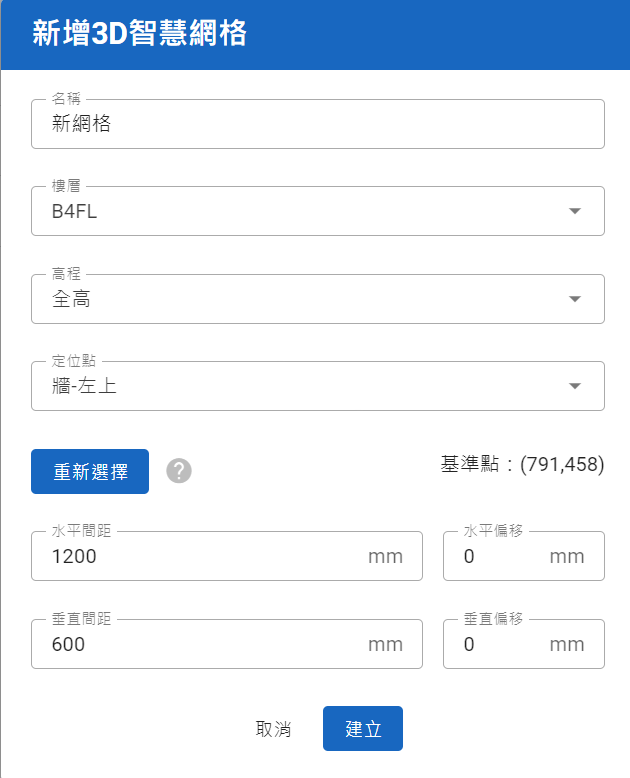 - 水平間距/偏移量: 設定網格單元(也就是一個網格)的寬度,建議以高架地板或(重型)天花板的單元寬度為設定值。「偏移量」則允許以帶有正負值的偏移量決定網格是否需要自定位點的X軸進行偏移,以避免切割過多的高架地板或(重型)天花板單元