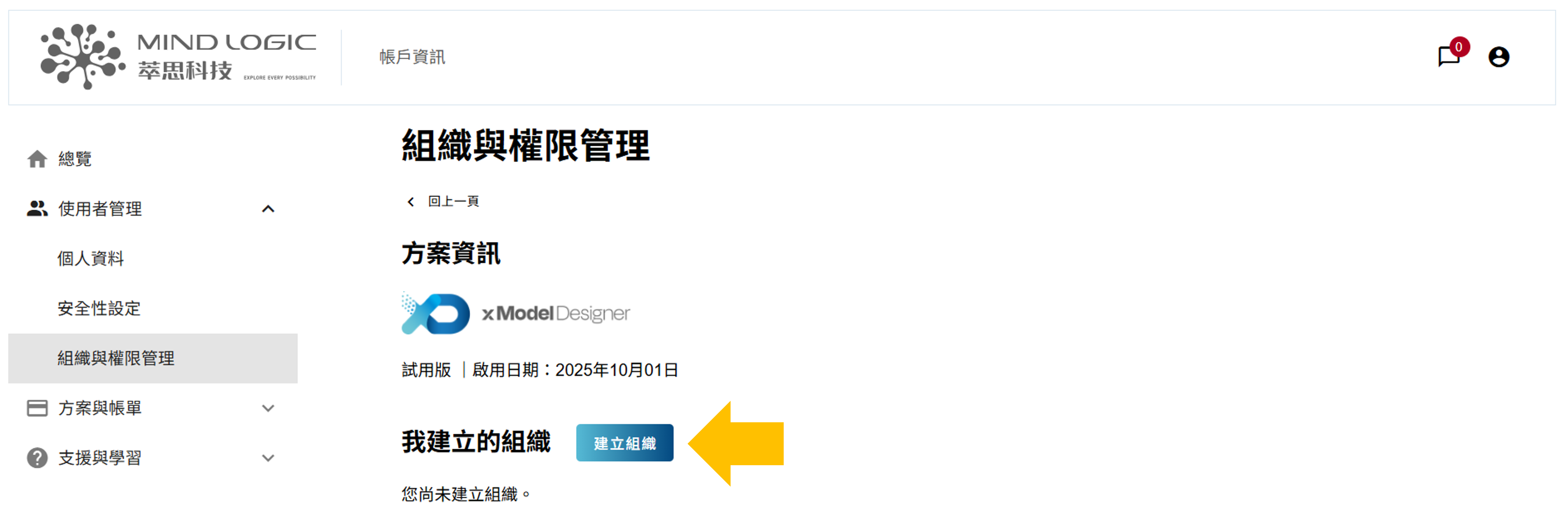 - 在方案與組織資訊畫面中,點擊「建立組織」按鈕,並按照畫面指引,完成第一個組織的建立