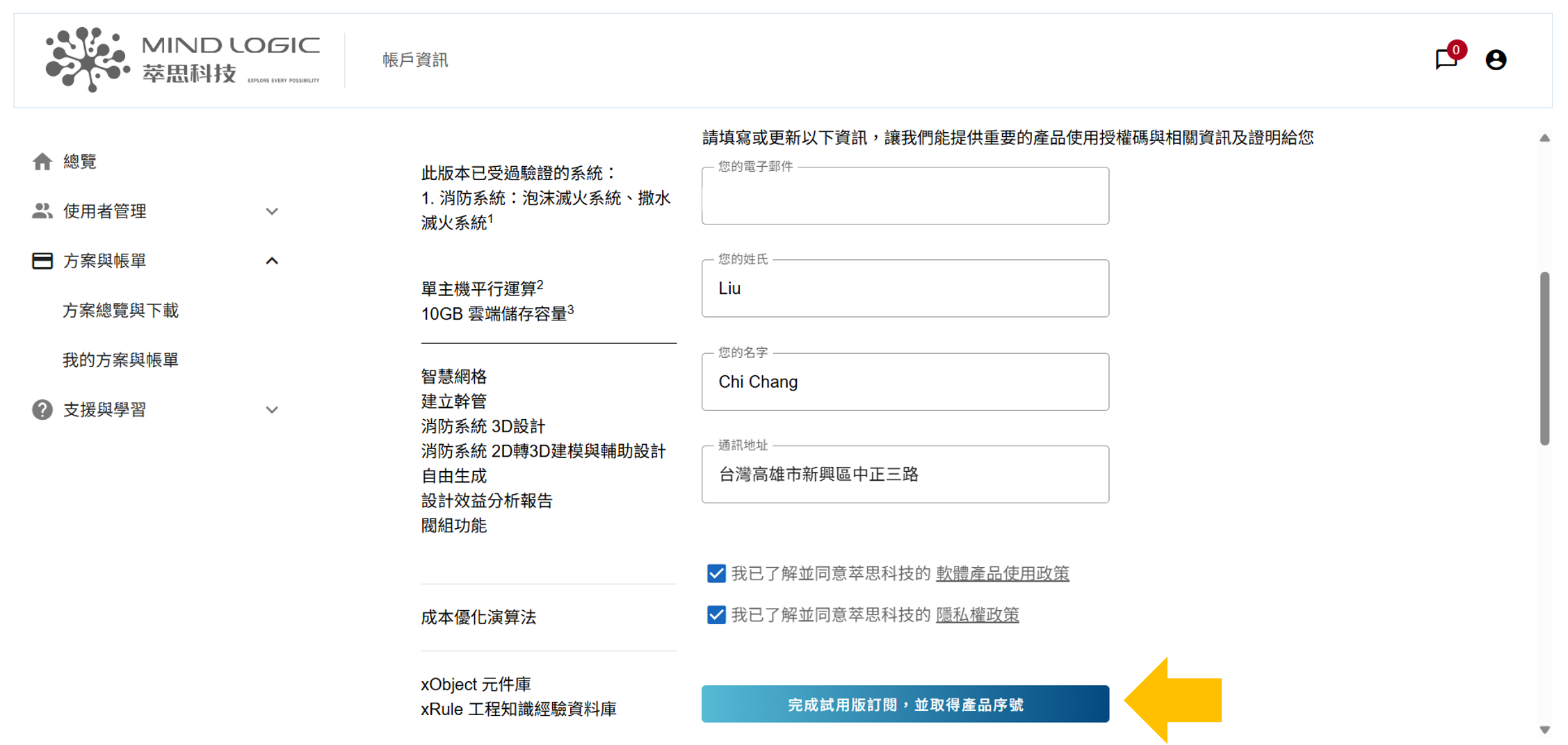 - 確認訂閱者資料無誤後,點擊「完成試用版訂閱,並取得產品序號」按鈕