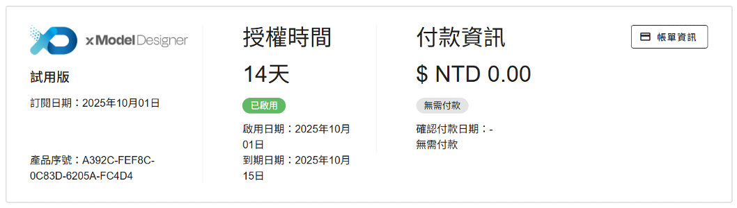 - 啟用方案之後,您將看到方案資訊上的「授權時間」資訊中,出現「已啟用」的綠燈,表示您已完成方案的啟用,並且可以開始使用xModel Designer了!