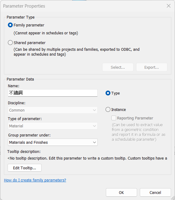 - 查看該視窗中顯示的材質名稱是否符合需求,若缺少適合的選項,則可以點及下方的新增紐自行新增符合需求的材質名稱,若沒有符合的材料名稱,則可點擊下方的新增鍵,自行新增需要的材質名稱。詳細方式可上一個非參數元件教學