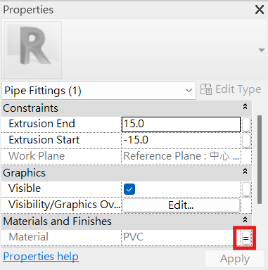 - 依照型錄提供的材料資訊,新增材質於相對應的元件模型上,藉此在BIM模型中呈現更貼近現況的樣貌,先點擊欲上材質的管件輪廓,並於左方性質視窗中,找到材質欄位,點擊欄位末端的方框,呼叫材質性質視窗