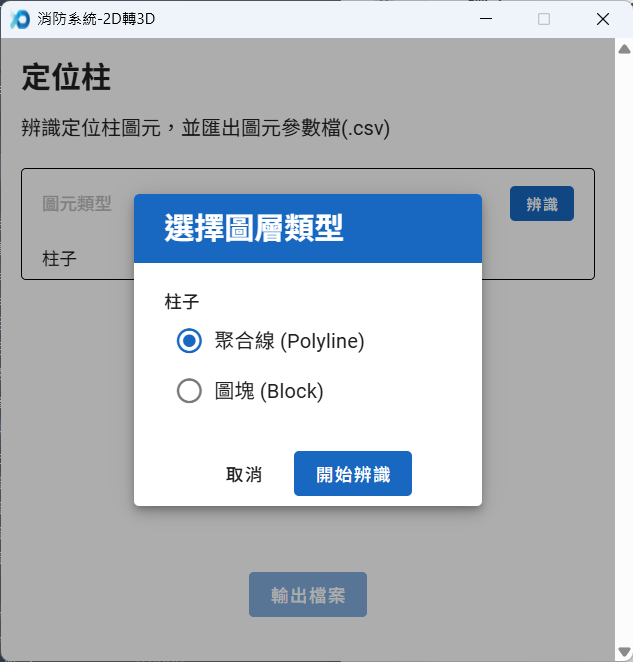 - 完成辨識後,點擊「輸出檔案」,指定定位柱圖元檔案所儲存的資料夾位置後,即可完成圖元辨識。