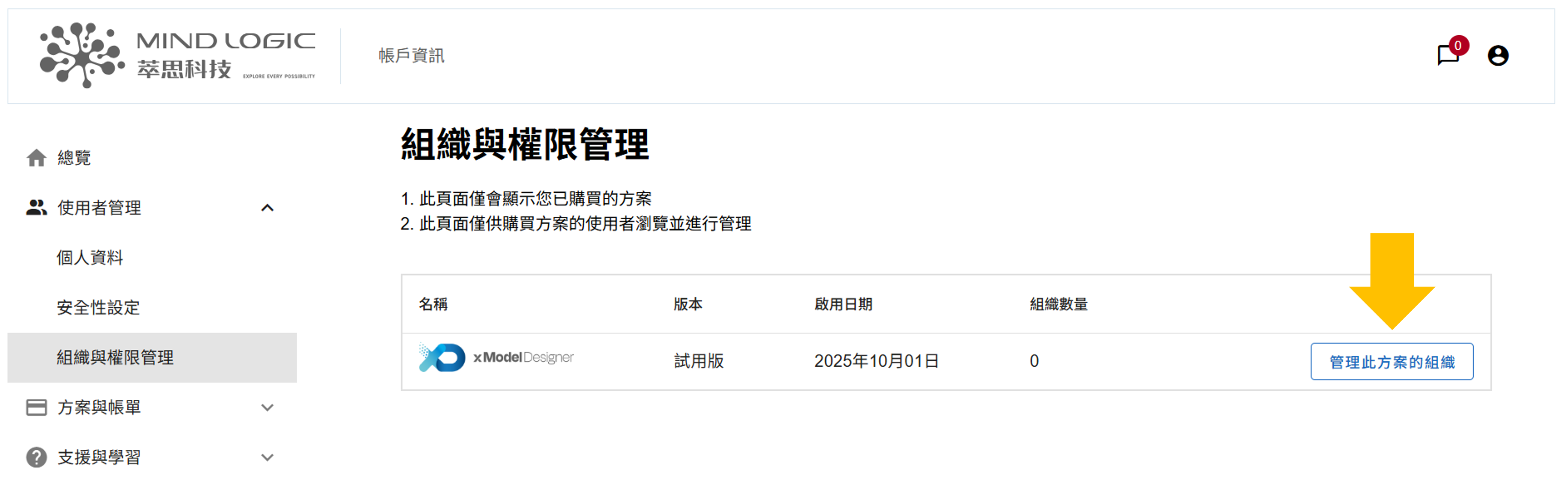 - 點擊「管理此方案的組織」按鈕,查看目前所訂閱的方案中的組織資訊