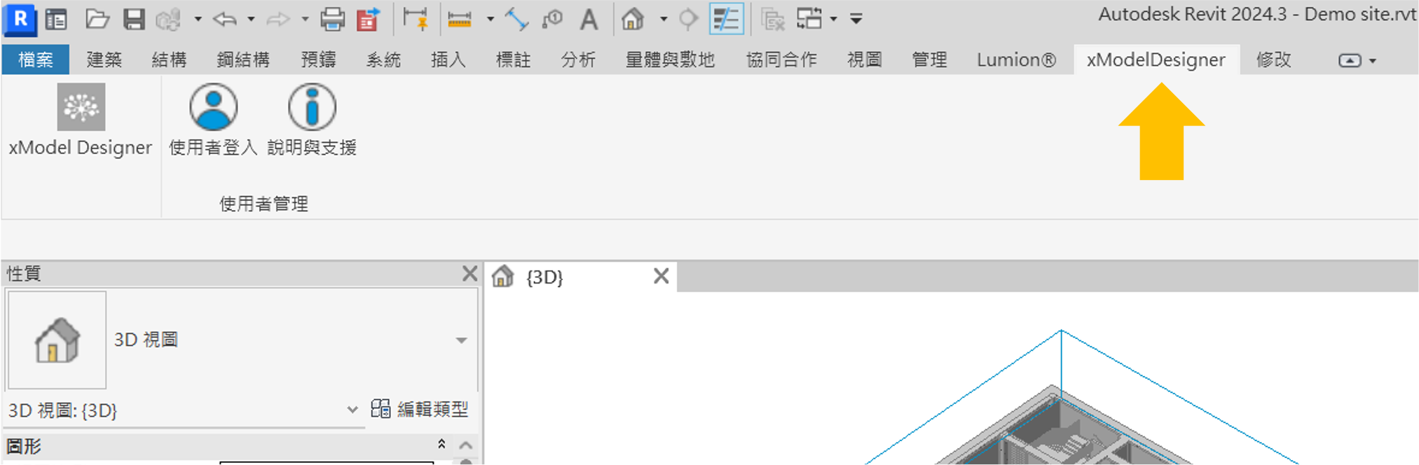 - 安裝完成後,開啟您的Revit應用程式,就能夠在Revit的主要頁籤中看到xModel Designer的頁籤,您就可以開始登入與使用了!