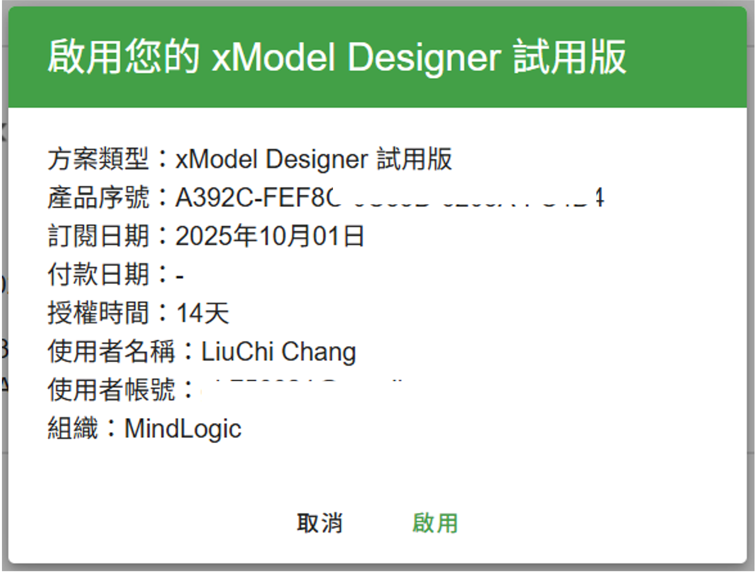 - 啟用方案之後,您將看到方案資訊上的「授權時間」資訊中,出現「已啟用」的綠燈,表示您已完成方案的啟用,並且可以開始使用xModel Designer了!