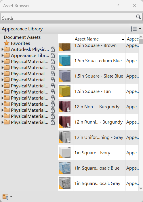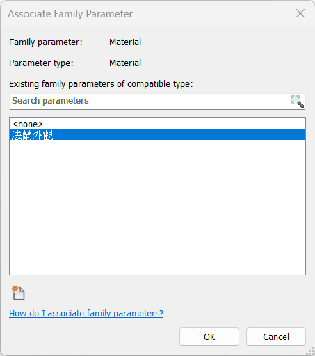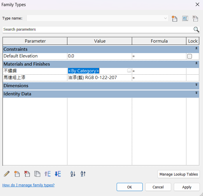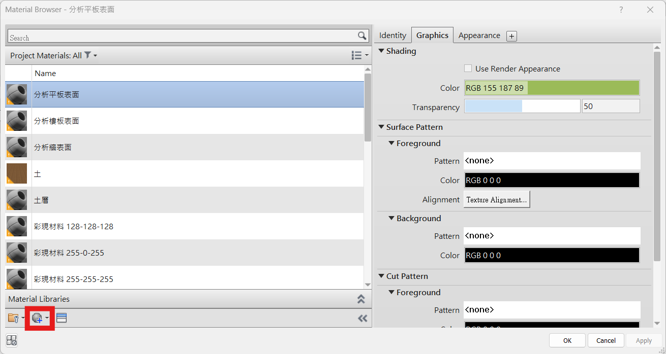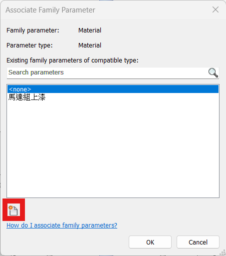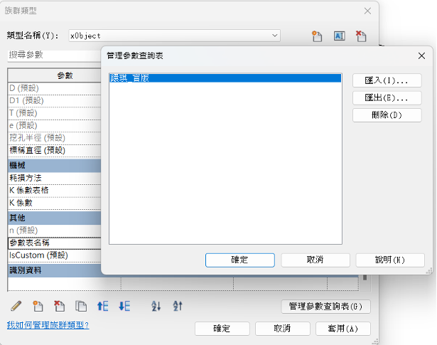 - 查看該視窗中顯示的材質名稱是否符合需求,若缺少適合的選項,則可以點及下方的新增紐自行新增符合需求的材質名稱,若沒有符合的材料名稱,則可點擊下方的新增鍵,自行新增需要的材質名稱。詳細方式可上一個非參數元件教學