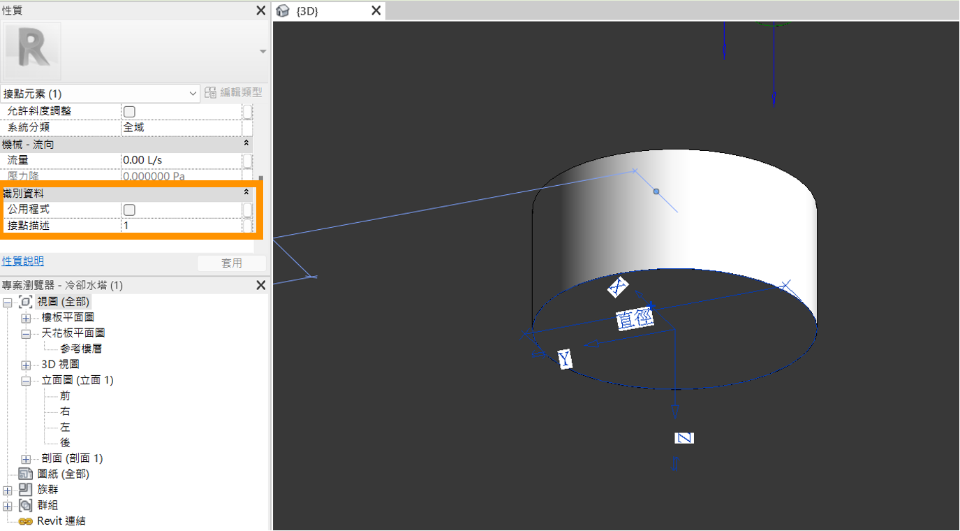 若是該設備有需要銜接管線的需求,點選「建立」頁籤中的接點功能,新增接點元素於銜接管線的平面處,接點元素的系統分類選擇「全域」,並於接點元素的接點描述欄位中,依序從1開始填入連接點ID,並可加入底線 _ ,接續填入管接點的用途或其他說明,如:「1_回水」。若是該管接點並沒有明確的用途,也可以只填ID,如:「1」。
