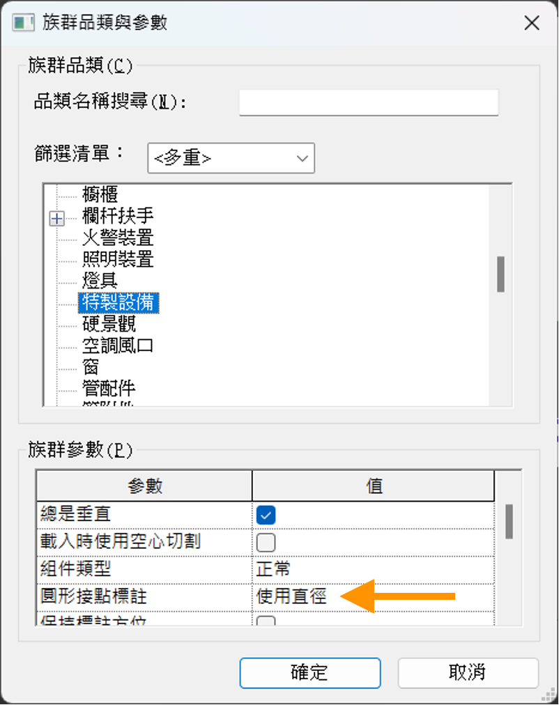 設定符合元件的系統分類,若該元件附有管接點,圓形接點標註需選擇「使用直徑」。