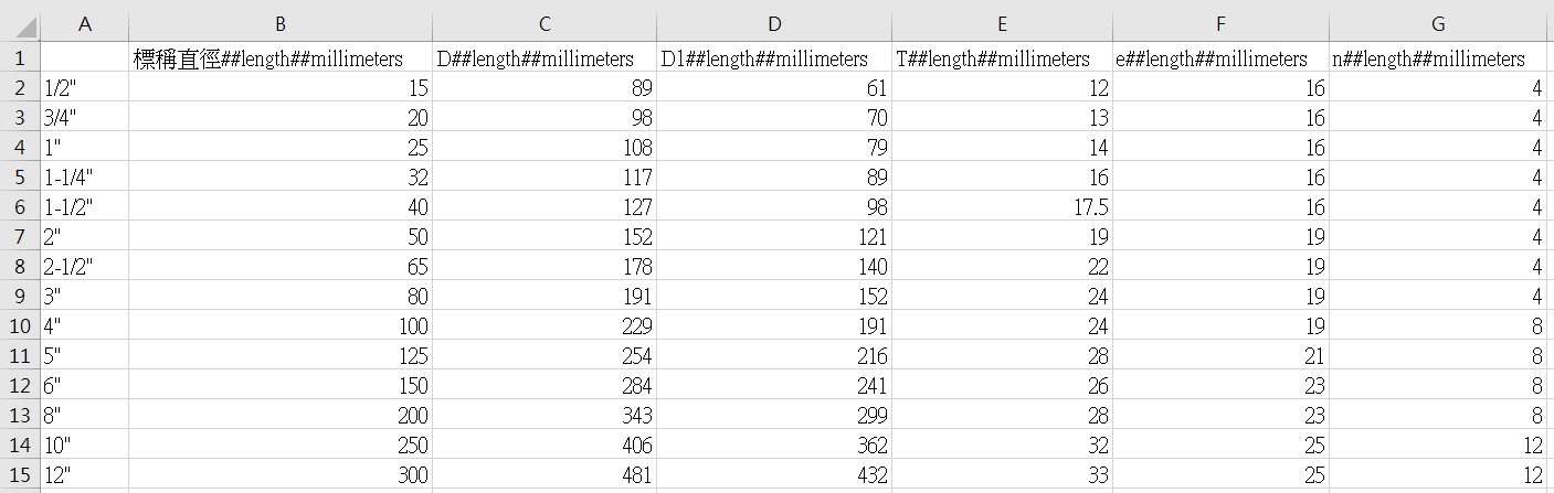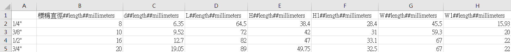 開啟EXCEL表單,將參考型錄提供的尺寸於B1欄位開始水平向填入,新增的格式為尺寸名稱##參數類型##單位,以下方型錄為例,若要填入L的值,我們須於第一欄填入:L##length##millimeters,並將型錄提供之數值依序填入對應的下方欄位中,最後儲存成CSV格式。