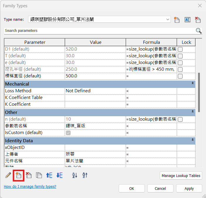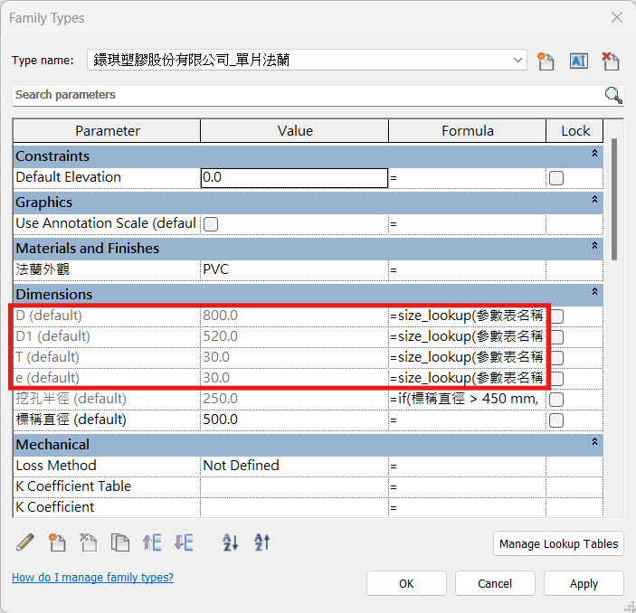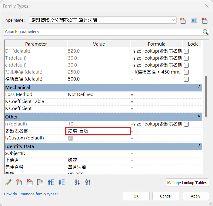 - 若是新增的參數需要讀取參數表中對應欄位的數值,需要在公式欄位中填入「size_lookup(參數表名稱,“CSV檔案中的欄位名稱”,若CSV檔案未提供該尺寸對應的數值時可運算該值的公式,標稱直徑)」