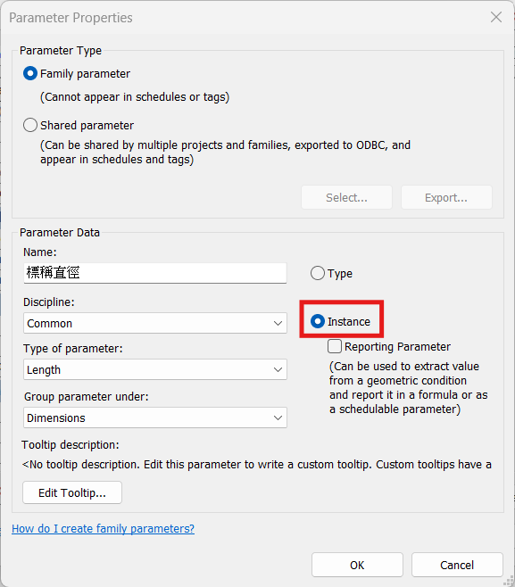 - 點擊視窗下方的新增鍵,新增「標稱直徑」參數,作為讀取參數表中數值的依據,並勾選「Instance」