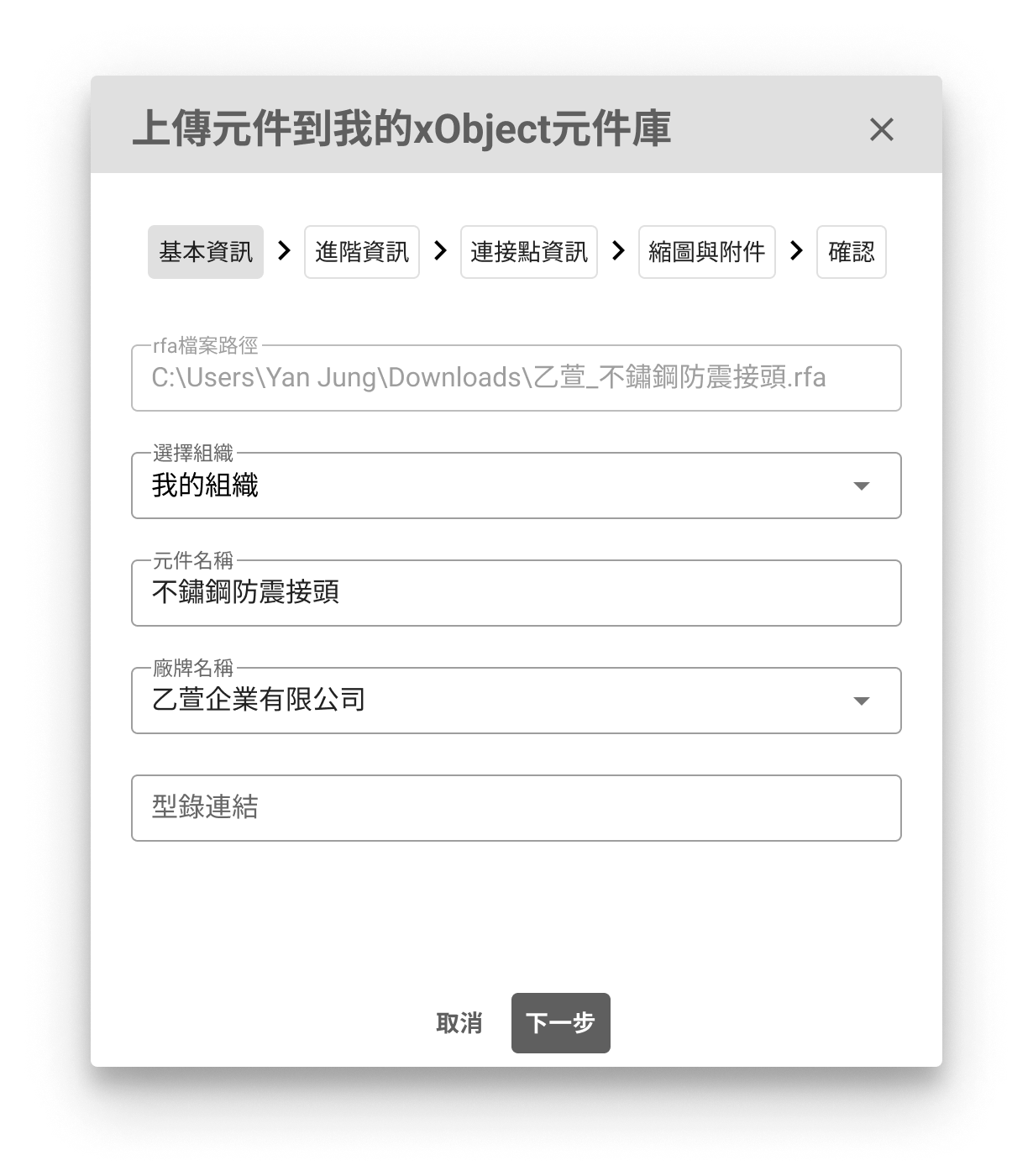 - 若是利用xModel Designer中的「元件庫 > 上傳元件」功能,自行上傳你已經建置好的xObject元件(格式為.rfa),該元件將會上傳至你所指定的組織的雲端空間,僅供該組織內的使用者使用。