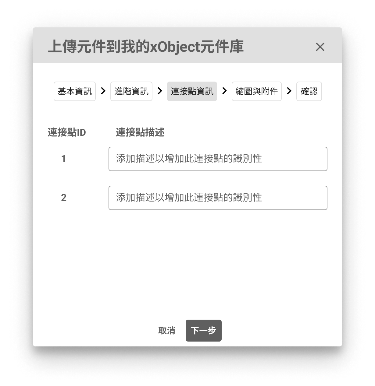 - 連接點描述:確認連接點ID與描述,連接點的描述可以幫助你在使用此元件時,更快速地識別出各個連接點。若你的連接點沒有任何描述,並不會影響元件的上傳。