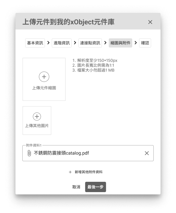 - 附件資料:此欄位為選填,若你提供其他詳細的附件資料,如元件的CAD或相關說明文件,將能幫助我們更詳細地檢查你的元件是否符合xObject的屬性要求及正確性